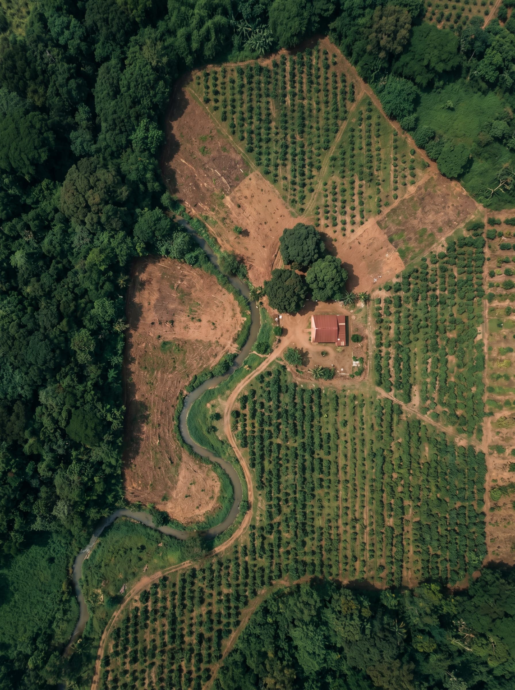 Before: Aerial satellite view of a tropical farm with a meandering river, a red-roofed homestead, and partially cleared landWe check every plot against satellite evidence and prepare a review trail.